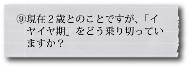 息子は早くから保育園に通っているせいか、言葉を話し出したのがとても早くて、2歳になる前から言葉でコミュニケーションがほとんどできていたんですが、保育園の先生によると、「イヤイヤ期」は自分の意思を伝えられないことに対する苛立ちから来ることが多いみたいです。ただ、保育園に通わせない家のお母さんなら、言葉ではないコミュニケーションで子どもを理解する、という呼吸があるのだと思うからそういう時期を過ごせることが、羨ましくもあります。 |