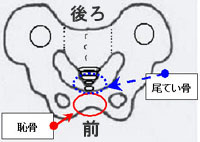 背骨の一番下、最後の骨が「尾てい骨」、前側のでっぱりが「恥骨」です。