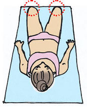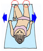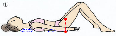 ずは仰向けになり、膝を立ててみましょう。膝を曲げる角度は、自分の心地よいところで構いません。 足と足の間、膝と膝の間をゲンコツひとつ位にしておきましょう。 <コツ> 寝っころがる前に確認しておくとやりやすいです。