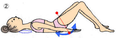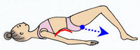 寝っころがったら、青い丸の所にちゃんと隙間が空いていることを確認しましょう。 腰の隙間は手のひら一枚が入る位です。この隙間が、骨盤の位置が正しくセットされているかどうかの目安になります。 ここがスタートポジションです。 まずは大きく息を吸って準備です。細く長く息を吐きながら、ゆっくりと尾てい骨だけを床から浮かすようにしながら骨盤を傾けていきます。 腰の下にあったスペースが無くなり、おへその裏が床に触れるところまで行ってみましょう。 おへその裏が床に触れたら、大きく息を吸いながら元のポジションまでゆっくり戻ってきます。 このときお尻のカーブが床を転がるようにすると、余計な力が入らずにリラックスして出来るかもしれません。
