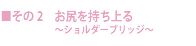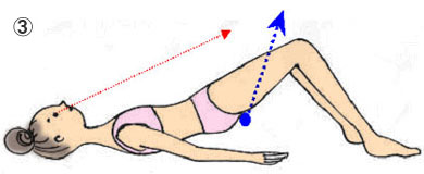 〜を何度か繰り返して馴れてきたら、息をゆっくりと吐きながら、背骨ひとつひとつを床から剥がしていくような意識でお尻を持ち上げていきます。 途中で息を吐ききってしまったら吸いなおして、再び動き始めましょう。 このときに一番重要なのは、「尾てい骨(●)」を常に天井の方向へ向けるよう意識することです。 こうすることで太ももの裏の筋肉に力が入り、お尻を下から支える強さにつながっていきます。