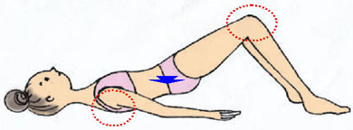 赤丸の肩甲骨・膝を動かさないように、息を吐きながらゆっくりと骨盤を床と平行にスライドしてみましょう。