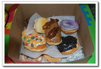青い空に浮かんでいるのは、タイヤ会社の広告の飛行船。ビーチシーズンになると、ビーチの上を、小型飛行機がビール広告の長い凧を引っぱりながら飛んでいくのも、L.A.らしい光景です。 最後に、大好きなドーナツ! これは、おみやげでいただいた、オレゴン州にある有名なドーナツやさんのもの。