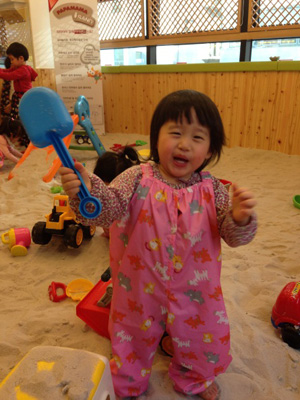 娘の通う保育園では、お砂遊びを積極的に勧めている。子どもの情緒安定や成長過程に、心理的にとても良いらしい。でも、お外のお砂場が少ないため、こうやってキッズカフェでないと接することができないのがちょっと残念……。