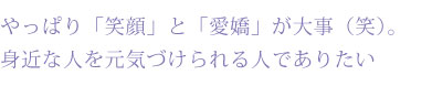 女性はとくに笑顔と愛嬌って本当に大事だなって思います。身近な人を元気づけたり癒してあげられる存在でありたいです。」