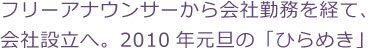 「何にもなし(笑)。会社を作って、自分の会社というものを持って社長にさえなれば、そこから展望が開けると思ったんです。枠が先でした。何にもないけどまず自分の会社を作る、というのが、2010年元旦のひらめきでした。でもひらめきが来たら、絶対間違ってないと思うんです。だから、そのあともいろんなことがぐるぐるぐるぐるつながっていってる感じがします」